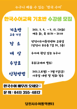 2021년 한국수어교육 기초반 수강생(선착순10명) 모집합니다○ 일 시 : 2021년 3월 9일 ~ 5월 13일○ 장 소 : 당진시수어통역센터(무수동 7길 35, 2층)○ 대 상 : 수어에 관심 있는 누구나(선착순 10명)○ 수강료 : 무료(...