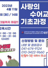 사랑의 수어교실 개강 안내 -기초반 - ▣개강 : 2023년 4월 11일(주1회/매주 화요일/14회) ▣시간 : 오전반 10:00 ~ 12:00/저녁반 19:00 ~ 21:00 - 중급반 - ▣개강 : 2023년 4월 13일(주1회/매주 목요일/14회) ▣시간 ...