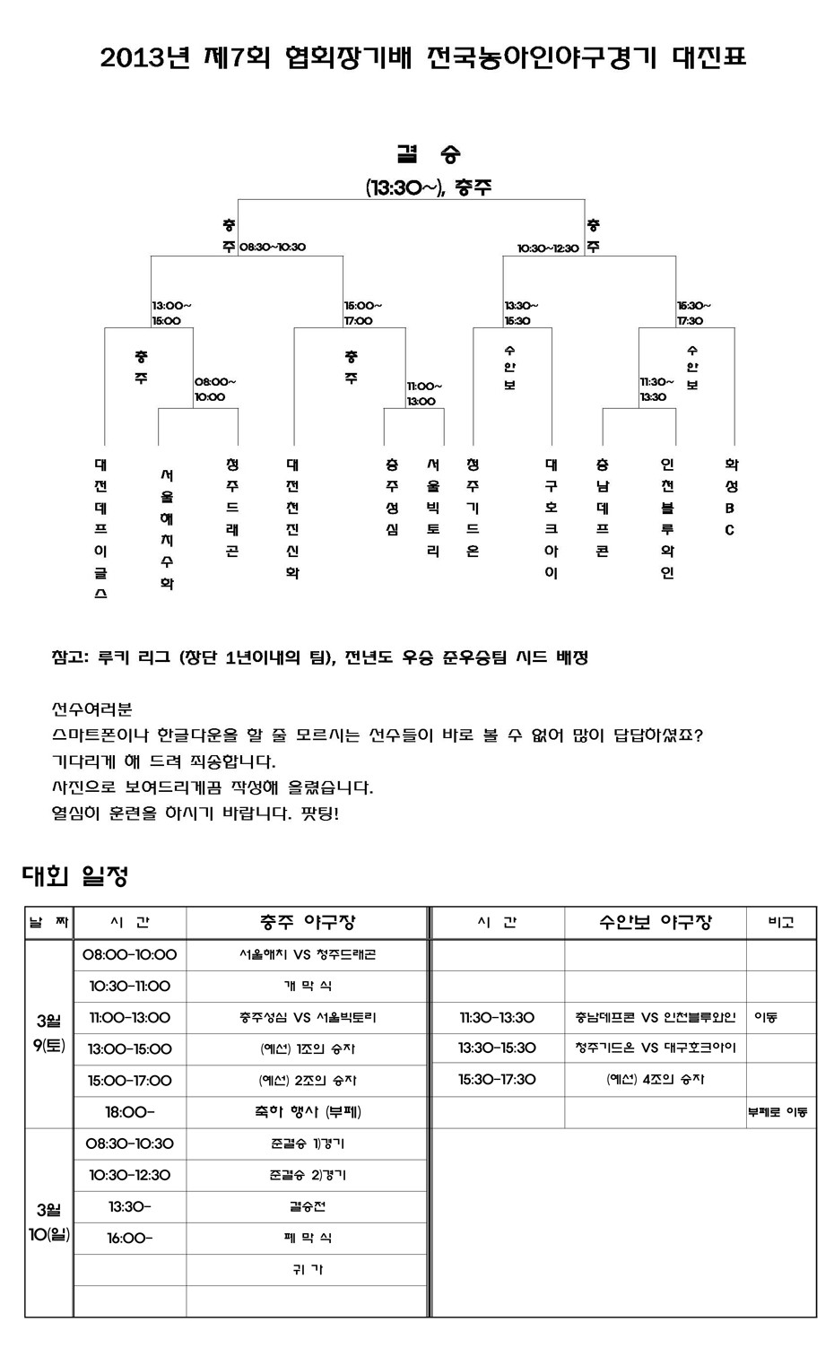 제7회 대한농아인야구협회장기 전국농아인야구대회 _일 시 : 2013년 3월 9(토)-3월 10(일) _장 소 : 충주야구장, 수안보야구장(충북 충주시 소재) _주 최 : 대한농아인야구협회 _후 원 : 동아꿈나무재단, 건국대충주...
