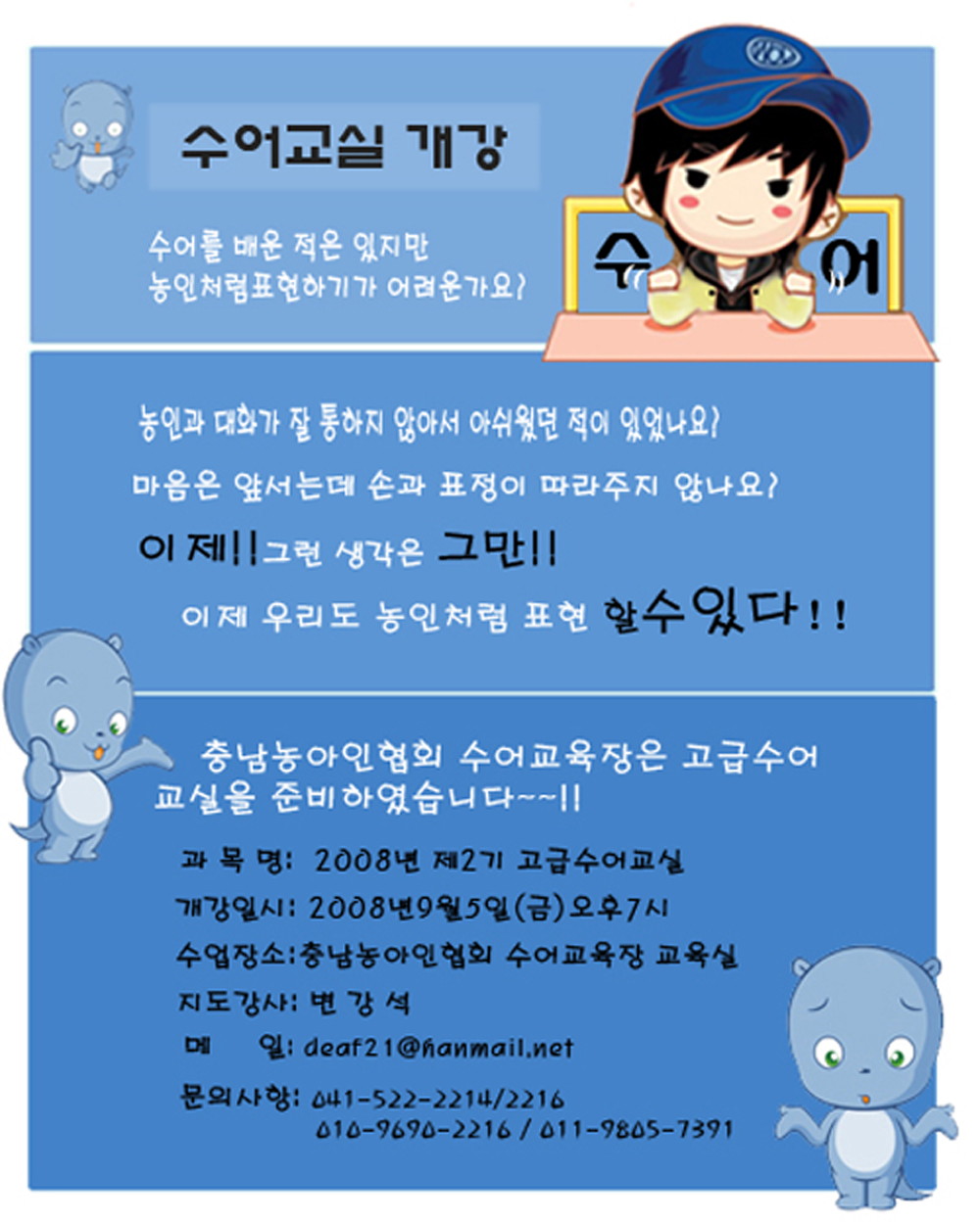 충남농아인협회에서 예쁜글씨(POP)를 배우고자 하는 청각장애인을 모집합니다~! 1. 모집 대상 : 충남 지역 거주하는 청각장애인 10명 내외. 2. 모집 기간 : 10월 6일(월) ~ 10월 27일(월) 3. 교육 일정 : 10월 28일(...