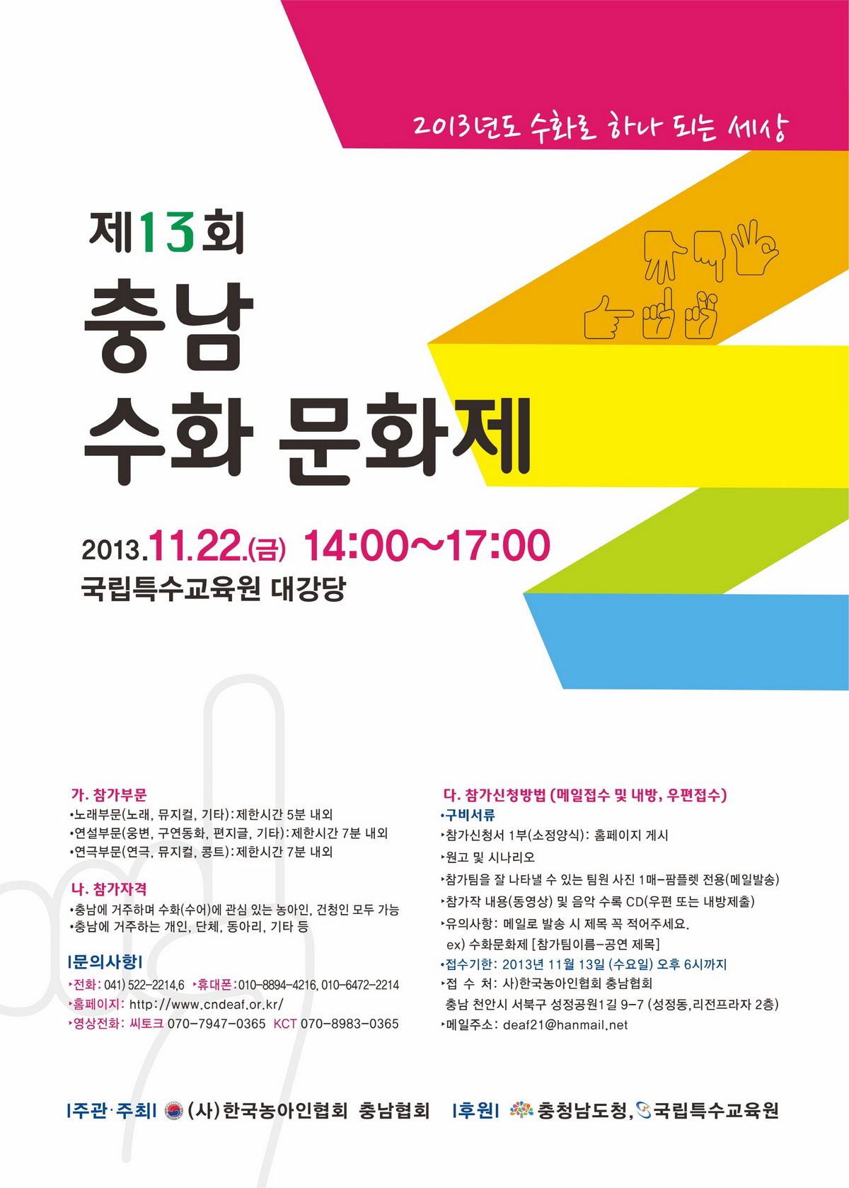 수화회화반(고급수화) 교육 안내<공고> 사)한국농아인협회 충청남도협회에서는 수화회화반(고급수화)을 실시하고자 아래와 같이 안내하오니 많은 관심과 적극적인 참여를 부탁드립니다. 또한 이 교육은 국가공인 수화...