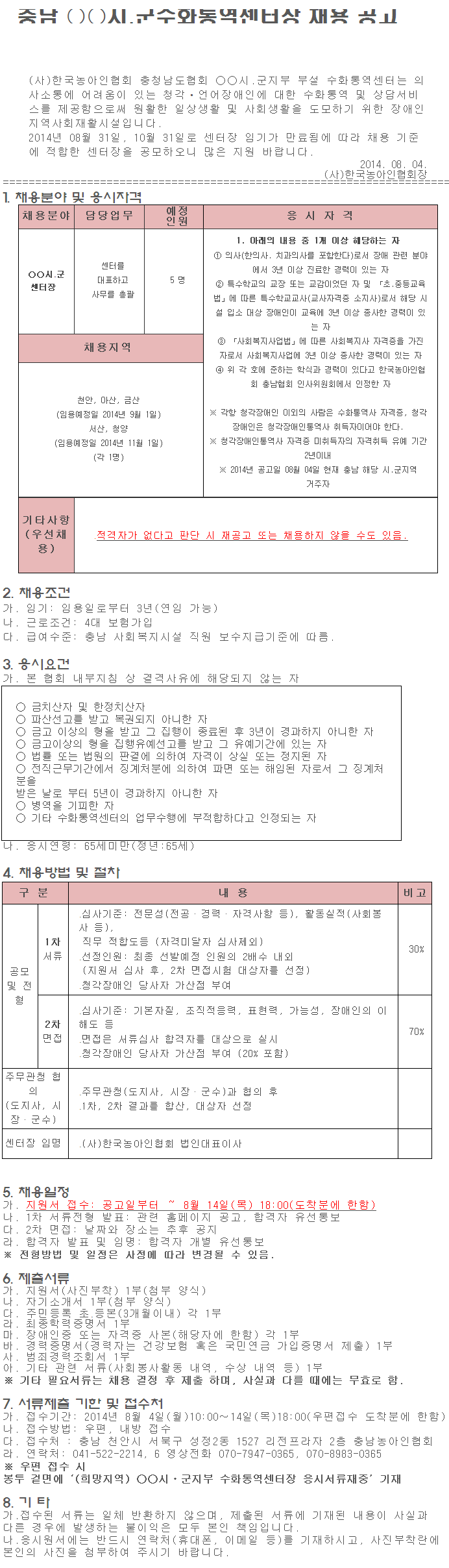 사단법인 충남농아인협회 태안군지부에서 태안군으로부터 수탁받아 운영하는 태안군 수화통역센터 운영 전담인력(수화통역사)모집 계획을 다음과 같이 공고합니다. 2014년 10월 22일 태안군 수화통역센터 인사위원장...