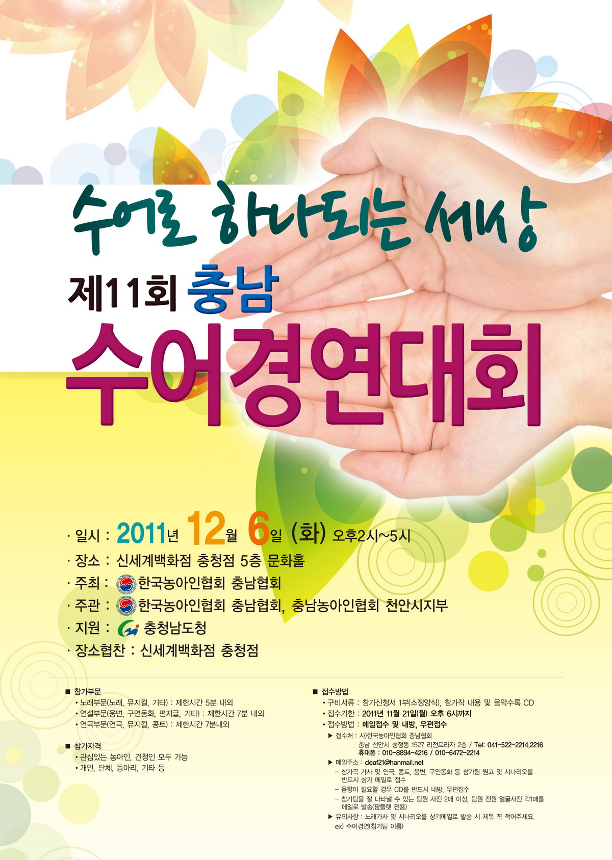 ● 행 사 명 : 제11회 수어로 하나되는 세상 충남수어(수화)경연대회 ● 일 시 : 2011년 12월 6일(화요일) 2시 ~ 5시 ● 장 소 : 신세계충청점 문화홀 5층 ● 주최, 주관 : (사)한국농아인협회 충남협회 ● 후 원 : 충청...