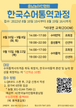 안녕하세요. 충남수어통역센터지원본부입니다. 2022년 8월 20일 '제4회 한국수어교육능력검정시험'을 준비하시는 분들을 위해 충남본부에서 검정시험 대비과정 사업을 진행하게 되었습니다! 대면교육이며, ...