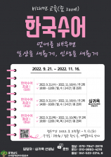 안녕하세요. 충남수어통역센터지원본부입니다. 무더위가 한풀 꺾이고 선선한 바람이 들어옵니다. 여름이 끝나고 가을을 맞이할 때가 되었습니다. 가을은 배움의 계절입니다. 다음 회기(9~11월)에 개설되는 한국수어교...