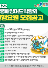 2022보령해양머드박람회 진행요원 모집공고 오는 7월 16일부터 8월 15일까지 31일간 보령시 대천해수욕장 일원에서 개최되는「2022보령해양머드박람회」의 성공적인 개최를 함께 할 책임감 있고 열정적인 진행요원을...